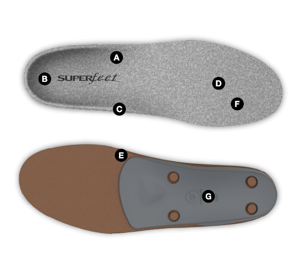 Den karakteristiske Superfeet-formen hjelper til med å stabilisere og støtte foten, noe som kan bidra til å redusere stress på føtter, ankler og knær